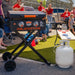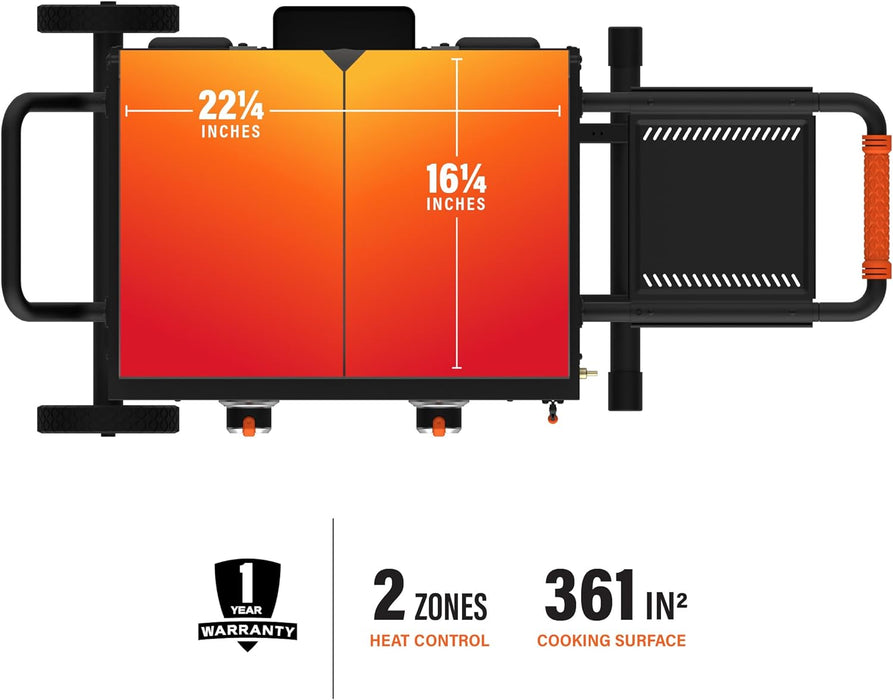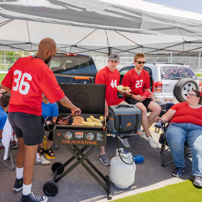 The 22" On The Go Scissor-Leg Griddle with Hood makes it easy to cook top-notch meals outdoors. It features a collapsible "Roll & Go" flexfold leg design that provides easy transportation of the griddle to the beach, park, campground, tailgate or any other outdoor location. The patented Rear Grease Management System utilizes a grease trap to provide easy cleanup and the hood keeps the cooking surface clean until you are ready to cook again. Blackstone's On The Go Flexfold Legs Griddle features a classically styled painted hood, an orange On The Go handle grip, updated national control knobs and a Piezo ignition. Dual stainless steel "H" style burners quickly and evenly distribute 24,000 BTUs of heat across the 22" (361 Sq. Inch) cooking surface.