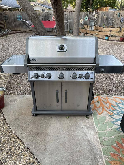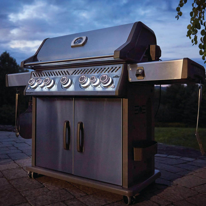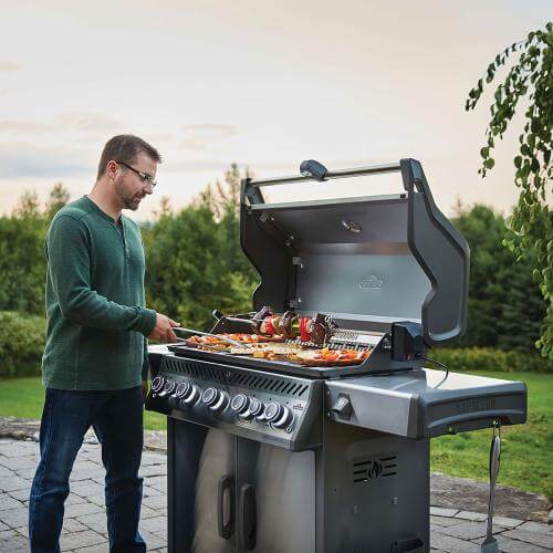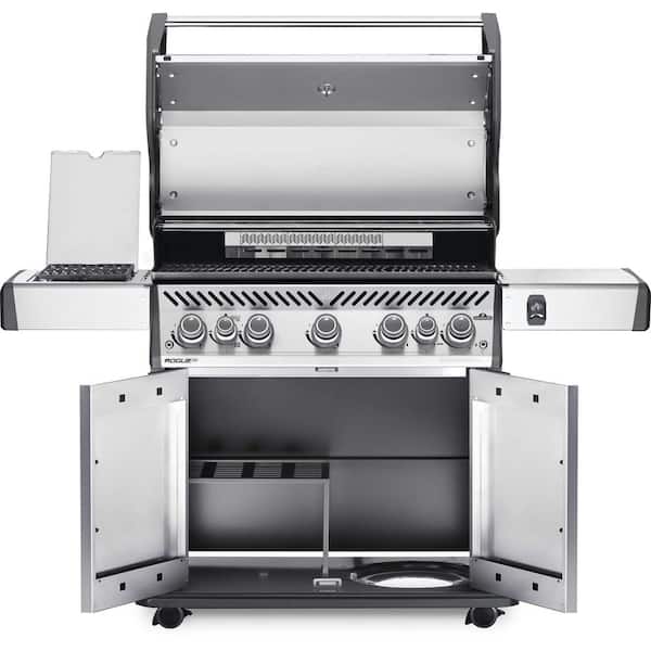 The Napoleon Rogue® SE 625 Stainless Steel Propane Gas Grill with Infrared Side Burner and Rear Burner is a durable stainless steel grill. Featuring five main burners, a rear rotisserie burner, and a high top lid, this grill has everything you need to create gourmet meals. Sear restaurant-style steaks on the integrated sear station, while generous side shelves provide plenty of prep space.