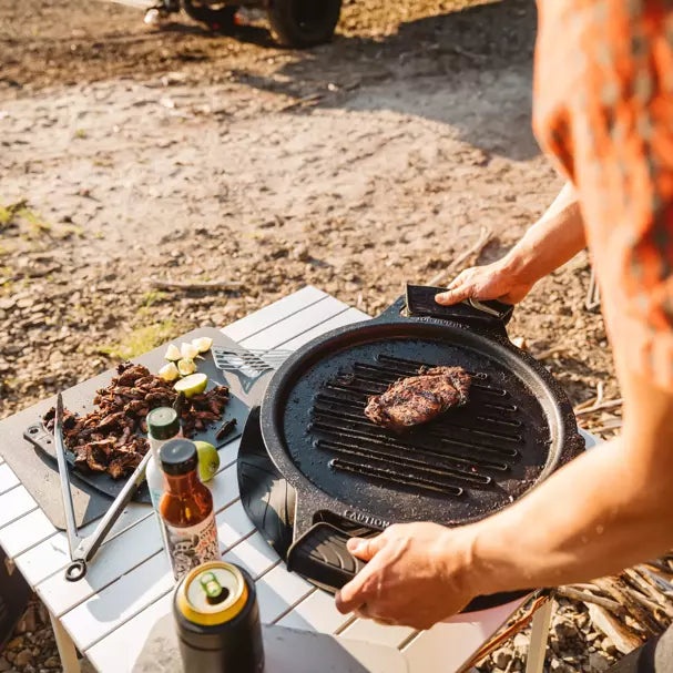 Open fire grilling, on the go. Custom-molded for the Ranger Cooking System, the Cast Iron Grill has wide grates and even heating for perfectly seared steaks and veggies. The Hub is the perfect adapter, allowing Ranger to become your go-to tool for a safe cooking experience over an open flame.