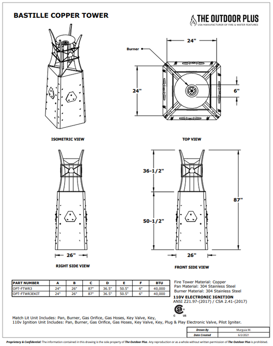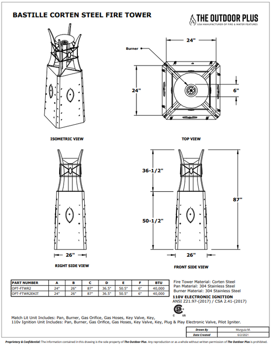 The Bastille Fire Tower is a striking, handcrafted centerpiece for your outdoor living space. Crafted from your choice of corten steel or hammered copper, this towering 87-inch sculpture demands attention. Ignite your fire with ease using the included 12V or 110V electronic ignition or a traditional match. Engineered to endure, the Smart Weather Electronic Ignition System powers through rain, snow, and gale-force winds, even rekindling if extinguished. For seamless control, integrate this LC Certified unit into your home automation system. Its robust glow plug igniter and compatibility with various control methods offer unparalleled convenience and reliability.